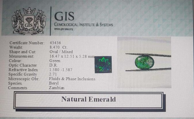 Beautiful 8.47 Ct. Emerald (Zambian Mines) Sava 9 Ratti Panna. Free Horoscope & Free Pundit Ji Advise / Consultation. Original Natural Lab certified gems by IGI GTL / Birth stones / Large Gem Selection of shree shubh Rashi Ratan Vedic dhan at Gem Mines. May Bhagwan Brahma, Vishnu, Shiv & Universe bless you.
