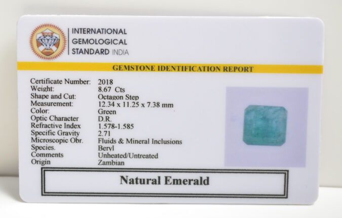 Beautiful 8.67 Cts Natural Emerald (AAA-Mines) sva 9+ Ratti EMERALD. Free Horoscope & Free Pundit Ji Astrological Advise / Consultation. Original Natural Lab certified gems by IGI GTL / Birth stones / Large Gem Selection of shree shubh Rashi Ratan Vedic dhan at Gem Mines. May Bhagwan Brahma, Vishnu, Shiv & Universe bless you.
