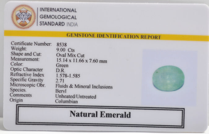 Beautiful 9 Cts Natural Emerald (AAA-Mines) sva 10+ Ratti EMERALD. Free Horoscope & Free Pundit Ji Astrological Advise / Consultation. Original Natural Lab certified gems by IGI GTL / Birth stones / Large Gem Selection of shree shubh Rashi Ratan Vedic dhan at Gem Mines. May Bhagwan Brahma, Vishnu, Shiv & Universe bless you.