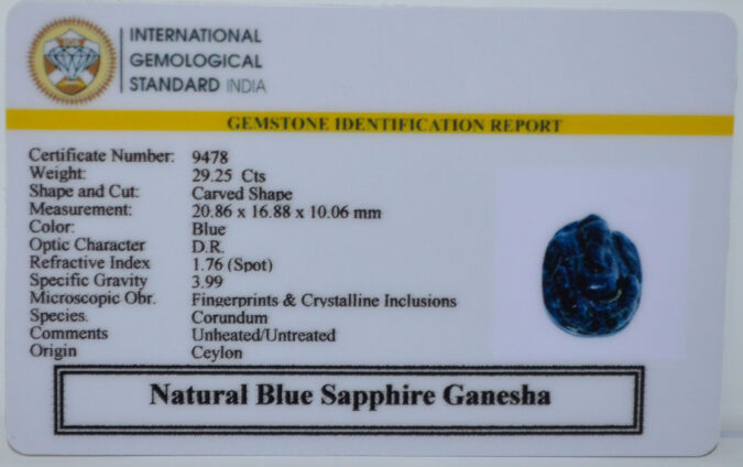 Beautiful 29.25 Cts Natural Blue Sapphire Ganesha (AAA+-Mines) sva 32+ Ratti Ganesh Blue Sapphire. Free Horoscope & Free Pundit Ji Astrological Advise / Consultation. Original Natural Lab certified gems by IGI GTL / Birth stones / Large Gem Selection of shree shubh Rashi Ratan Vedic dhan at Gem Mines. May Bhagwan Brahma, Vishnu, Shiv & Universe bless you.