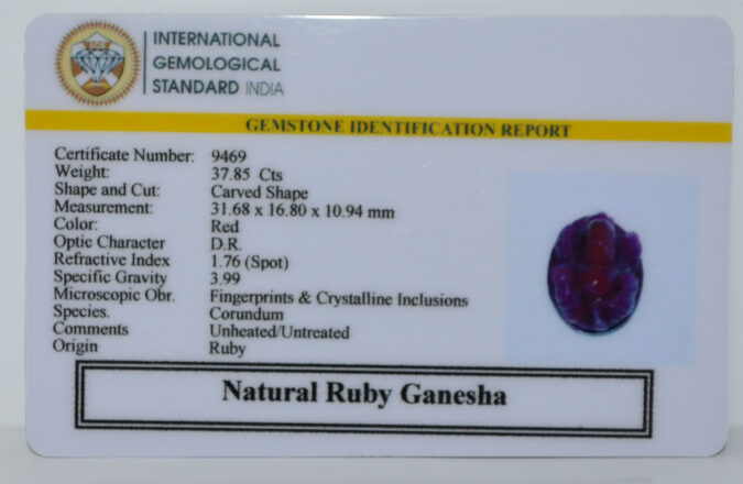 Beautiful 37.85 Cts Natural Ruby Ganesha (AAA+-Mines) sva 42+ Ratti Ganesh Ruby. Free Horoscope & Free Pundit Ji Astrological Advise / Consultation. Original Natural Lab certified gems by IGI GTL / Birth stones / Large Gem Selection of shree shubh Rashi Ratan Vedic dhan at Gem Mines. May Bhagwan Brahma, Vishnu, Shiv & Universe bless you.