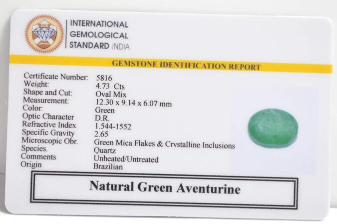 Beautiful 4.73 Cts Natural Green Aventurine (AAA+-Mines) sva 5+ Ratti GREEN AVENTURINE. Free Horoscope & Free Pundit Ji Astrological Advise / Consultation. Original Natural Lab certified gems by IGI GTL / Birth stones / Large Gem Selection of shree shubh Rashi Ratan Vedic dhan at Gem Mines. May Bhagwan Brahma, Vishnu, Shiv & Universe bless you.