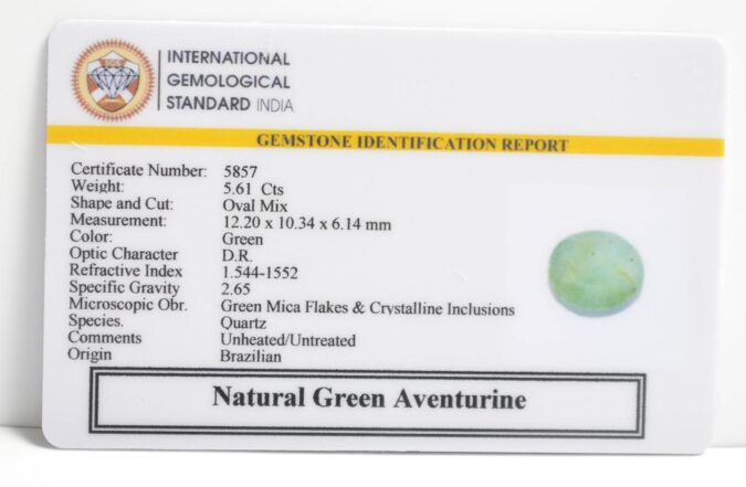 Beautiful 5.61 Cts Natural Green Aventurine (AAA+-Mines) sva 6+ Ratti GREEN AVENTURINE. Free Horoscope & Free Pundit Ji Astrological Advise / Consultation. Original Natural Lab certified gems by IGI GTL / Birth stones / Large Gem Selection of shree shubh Rashi Ratan Vedic dhan at Gem Mines. May Bhagwan Brahma, Vishnu, Shiv & Universe bless you.