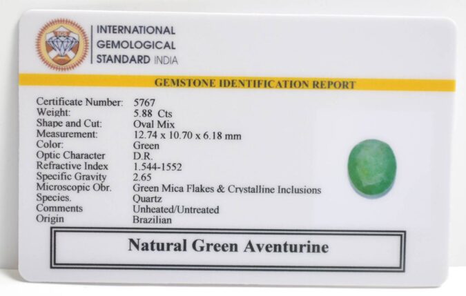 Beautiful 5.88 Cts Natural Green Aventurine (AAA+-Mines) sva 6+ Ratti GREEN AVENTURINE. Free Horoscope & Free Pundit Ji Astrological Advise / Consultation. Original Natural Lab certified gems by IGI GTL / Birth stones / Large Gem Selection of shree shubh Rashi Ratan Vedic dhan at Gem Mines. May Bhagwan Brahma, Vishnu, Shiv & Universe bless you.
