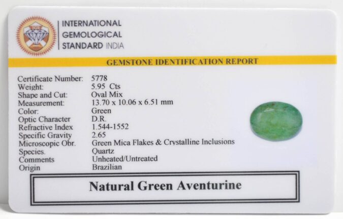 Beautiful 5.95 Cts Natural Green Aventurine (AAA+-Mines) sva 6+ Ratti GREEN AVENTURINE. Free Horoscope & Free Pundit Ji Astrological Advise / Consultation. Original Natural Lab certified gems by IGI GTL / Birth stones / Large Gem Selection of shree shubh Rashi Ratan Vedic dhan at Gem Mines. May Bhagwan Brahma, Vishnu, Shiv & Universe bless you.