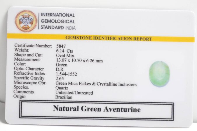 Beautiful 6.14 Cts Natural Green Aventurine (AAA-Mines) sva 6+ Ratti GREEN AVENTURINE. Free Horoscope & Free Pundit Ji Astrological Advise / Consultation. Original Natural Lab certified gems by IGI GTL / Birth stones / Large Gem Selection of shree shubh Rashi Ratan Vedic dhan at Gem Mines. May Bhagwan Brahma, Vishnu, Shiv & Universe bless you.