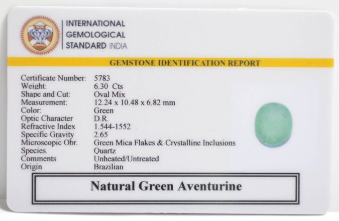 Beautiful 6.3 Cts Natural Green Aventurine (AAA+-Mines) sva 7+ Ratti GREEN AVENTURINE. Free Horoscope & Free Pundit Ji Astrological Advise / Consultation. Original Natural Lab certified gems by IGI GTL / Birth stones / Large Gem Selection of shree shubh Rashi Ratan Vedic dhan at Gem Mines. May Bhagwan Brahma, Vishnu, Shiv & Universe bless you.
