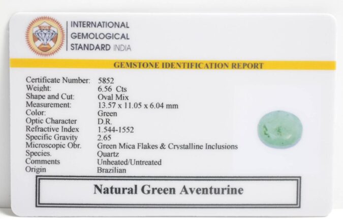 Beautiful 6.56 Cts Natural Green Aventurine (AAA-Mines) sva 7+ Ratti GREEN AVENTURINE. Free Horoscope & Free Pundit Ji Astrological Advise / Consultation. Original Natural Lab certified gems by IGI GTL / Birth stones / Large Gem Selection of shree shubh Rashi Ratan Vedic dhan at Gem Mines. May Bhagwan Brahma, Vishnu, Shiv & Universe bless you.