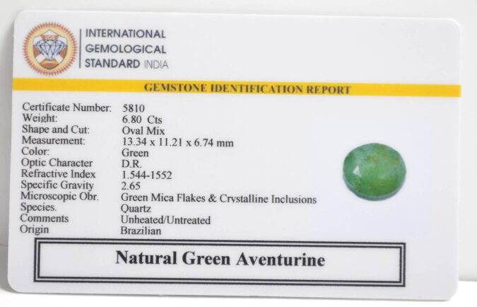 Beautiful 6.8 Cts Natural Green Aventurine (AAA+-Mines) sva 7+ Ratti GREEN AVENTURINE. Free Horoscope & Free Pundit Ji Astrological Advise / Consultation. Original Natural Lab certified gems by IGI GTL / Birth stones / Large Gem Selection of shree shubh Rashi Ratan Vedic dhan at Gem Mines. May Bhagwan Brahma, Vishnu, Shiv & Universe bless you.