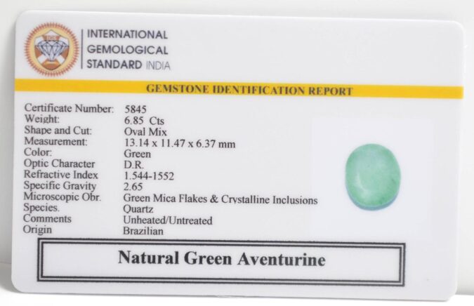 Beautiful 6.85 Cts Natural Green Aventurine (AAA-Mines) sva 7+ Ratti GREEN AVENTURINE. Free Horoscope & Free Pundit Ji Astrological Advise / Consultation. Original Natural Lab certified gems by IGI GTL / Birth stones / Large Gem Selection of shree shubh Rashi Ratan Vedic dhan at Gem Mines. May Bhagwan Brahma, Vishnu, Shiv & Universe bless you.
