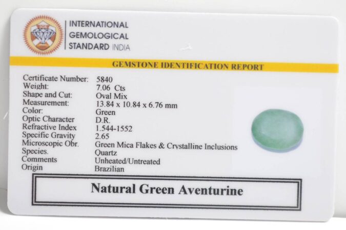 Beautiful 7.06 Cts Natural Green Aventurine (AAA-Mines) sva 7+ Ratti GREEN AVENTURINE. Free Horoscope & Free Pundit Ji Astrological Advise / Consultation. Original Natural Lab certified gems by IGI GTL / Birth stones / Large Gem Selection of shree shubh Rashi Ratan Vedic dhan at Gem Mines. May Bhagwan Brahma, Vishnu, Shiv & Universe bless you.