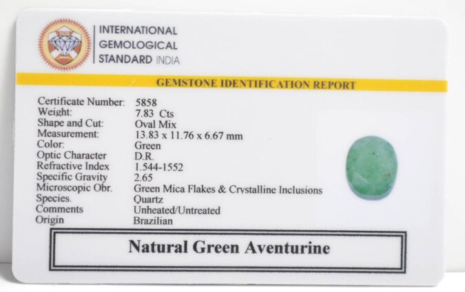 Beautiful 7.83 Cts Natural Green Aventurine (AAA+-Mines) sva 8+ Ratti GREEN AVENTURINE. Free Horoscope & Free Pundit Ji Astrological Advise / Consultation. Original Natural Lab certified gems by IGI GTL / Birth stones / Large Gem Selection of shree shubh Rashi Ratan Vedic dhan at Gem Mines. May Bhagwan Brahma, Vishnu, Shiv & Universe bless you.