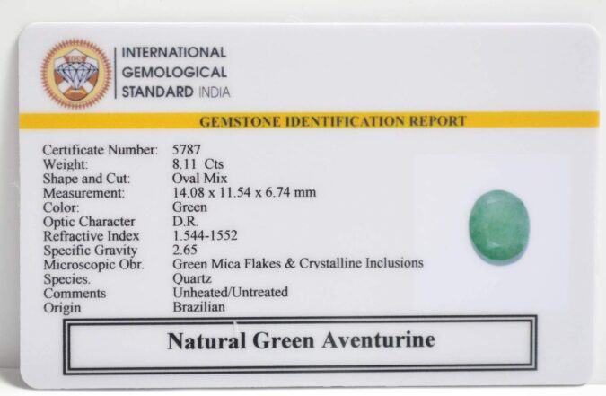 Beautiful 8.11 Cts Natural Green Aventurine (AAA+-Mines) sva 9+ Ratti GREEN AVENTURINE. Free Horoscope & Free Pundit Ji Astrological Advise / Consultation. Original Natural Lab certified gems by IGI GTL / Birth stones / Large Gem Selection of shree shubh Rashi Ratan Vedic dhan at Gem Mines. May Bhagwan Brahma, Vishnu, Shiv & Universe bless you.