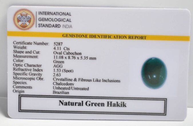 Beautiful 4.11 Cts Natural Green Hakik (Top-Mines) sva 4+ Ratti GREEN HAKIK. Free Horoscope & Free Pundit Ji Astrological Advise / Consultation. Original Natural Lab certified gems by IGI GTL / Birth stones / Large Gem Selection of shree shubh Rashi Ratan Vedic dhan at Gem Mines. May Bhagwan Brahma, Vishnu, Shiv & Universe bless you. The Green Hakik stone is highly valued in astrology for its soothing and balancing energies. Wearing this gem is believed to calm the mind, increase focus, and promote emotional stability. Green Hakik benefits also include attracting prosperity, improving decision-making, and protecting the wearer from negativity. It is said to bring harmony in relationships and support overall well-being, making it a meaningful gemstone for both spiritual and daily life needs.