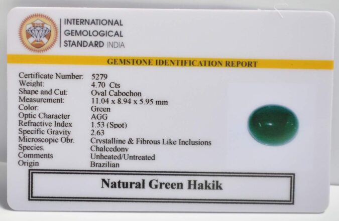 Beautiful 4.7 Cts Natural Green Hakik (Top-Mines) sva 5+ Ratti GREEN HAKIK. Free Horoscope & Free Pundit Ji Astrological Advise / Consultation. Original Natural Lab certified gems by IGI GTL / Birth stones / Large Gem Selection of Shree Shubh Rashi Ratan Vedic Dhan at Gem Mines. May Bhagwan Brahma, Vishnu, Shiv & Universe bless you. This Green Haqiq stone is valued for its soothing green color and its natural energy-balancing qualities. The Green Haqiq benefit includes promoting mental clarity, enhancing emotional stability, boosting self-confidence, attracting positive energies, and offering protection from negativity. Wearing this authentic Green Haqiq gemstone adds elegance, spiritual strength, inner harmony, and a sense of calm, making it a meaningful and cherished addition to any gemstone .