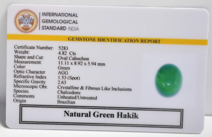 Beautiful 4.82 Cts Natural Green Hakik (Top-Mines) sva 5+ Ratti GREEN HAKIK. Free Horoscope & Free Pundit Ji Astrological Advise / Consultation. Original Natural Lab certified gems by IGI GTL / Birth stones / Large Gem Selection of Shree Shubh Rashi Ratan Vedic Dhan at Gem Mines. May Bhagwan Brahma, Vishnu, Shiv & Universe bless you. This Green Haqiq stone is treasured for its vibrant green shade and its powerful natural energy that promotes balance and positivity. The Green Haqiq benefit includes enhancing mental clarity, supporting emotional stability, boosting self-confidence, attracting positive energies, and providing protection from negative influences. Wearing this authentic Green Haqiq gemstone adds elegance, spiritual strength, inner peace, and a sense of harmony, making it a meaningful and valuable addition to any gemstone .