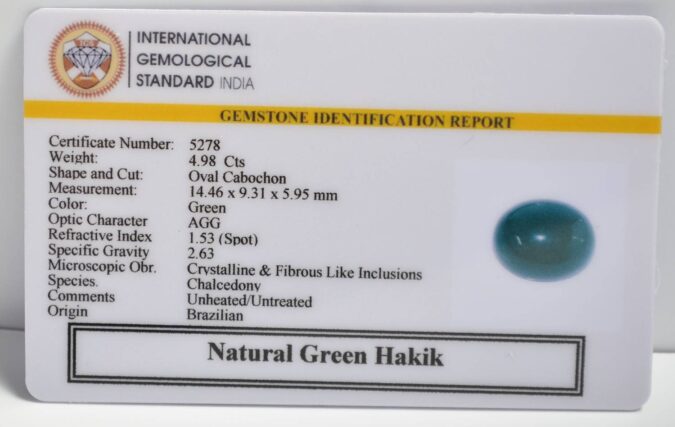 Beautiful 4.98 Cts Natural Green Hakik (Top-Mines) sva 5+ Ratti GREEN HAKIK. Free Horoscope & Free Pundit Ji Astrological Advise / Consultation. Original Natural Lab certified gems by IGI GTL / Birth stones / Large Gem Selection of Shree Shubh Rashi Ratan Vedic Dhan at Gem Mines. May Bhagwan Brahma, Vishnu, Shiv & Universe bless you. This Green Haqiq stone is admired for its calming green hue and its exceptional ability to harmonize energies and promote overall well-being. The Green Haqiq benefit includes enhancing mental clarity, boosting self-confidence, promoting emotional stability, attracting positive vibrations, and offering protection from negativity. Wearing this genuine Green Haqiq gemstone adds elegance, spiritual strength, inner peace, and a sense of balance, making it a treasured and meaningful addition to any gemstone .