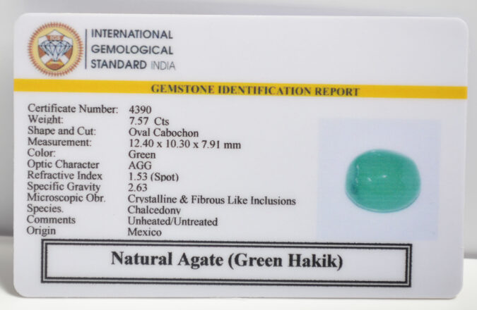 Beautiful 7.57 Cts Natural Agate (Green Hakik) (Top-Mines) sva 8+ Ratti GREEN HAKIK. Free Horoscope & Free Pundit Ji Astrological Advise / Consultation. Original Natural Lab certified gems by IGI GTL / Birth stones / Large Gem Selection of shree shubh Rashi Ratan Vedic dhan at Gem Mines. May Bhagwan Brahma, Vishnu, Shiv & Universe bless you.