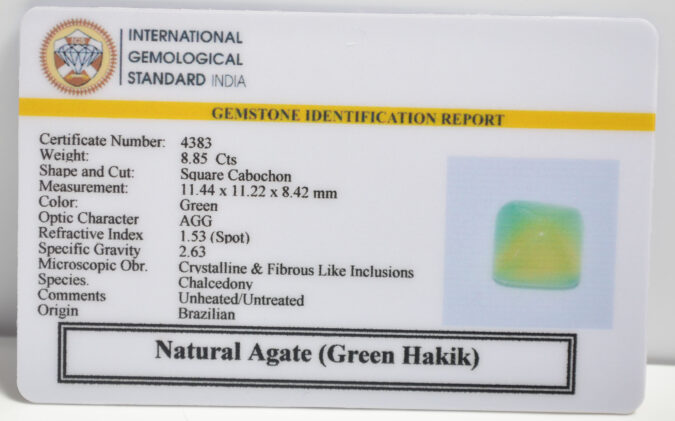 Beautiful 8.85 Cts Natural Agate (Green Hakik) (Top+-Mines) sva 9+ Ratti GREEN HAKIK. Free Horoscope & Free Pundit Ji Astrological Advise / Consultation. Original Natural Lab certified gems by IGI GTL / Birth stones / Large Gem Selection of shree shubh Rashi Ratan Vedic dhan at Gem Mines. May Bhagwan Brahma, Vishnu, Shiv & Universe bless you.
