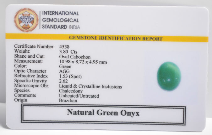 Beautiful 3.8 Cts Natural Green Onyx (Top-Mines) sva 4+ Ratti GREEN ONYX. Free Horoscope & Free Pundit Ji Astrological Advise / Consultation. Original Natural Lab certified gems by IGI GTL / Birth stones / Large Gem Selection of shree shubh Rashi Ratan Vedic dhan at Gem Mines. May Bhagwan Brahma, Vishnu, Shiv & Universe bless you.