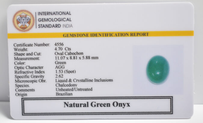 Beautiful 4.7 Cts Natural Green Onyx (Top-Mines) sva 5+ Ratti GREEN ONYX. Free Horoscope & Free Pundit Ji Astrological Advise / Consultation. Original Natural Lab certified gems by IGI GTL / Birth stones / Large Gem Selection of shree shubh Rashi Ratan Vedic dhan at Gem Mines. May Bhagwan Brahma, Vishnu, Shiv & Universe bless you.
