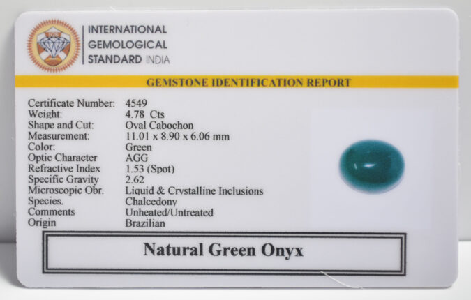 Beautiful 4.78 Cts Natural Green Onyx (Top-Mines) sva 5+ Ratti GREEN ONYX. Free Horoscope & Free Pundit Ji Astrological Advise / Consultation. Original Natural Lab certified gems by IGI GTL / Birth stones / Large Gem Selection of shree shubh Rashi Ratan Vedic dhan at Gem Mines. May Bhagwan Brahma, Vishnu, Shiv & Universe bless you.