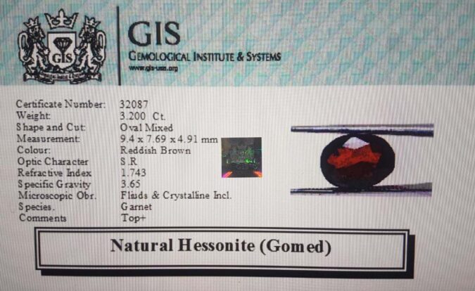Beautiful 3.2 Ct. Hessonite (Gomed) (Ceylon Sri Lanka Mines) Sava 3 Ratti Gomed. Free Horoscope & Free Pundit Ji Advise / Consultation. Original Natural Lab certified gems by IGI GTL / Birth stones / Large Gem Selection of shree shu3bh Rashi Ratan Vedic dhan at Gem Mines. May Bhagwan Brahma, Vishnu, Shiv & Universe bless you.