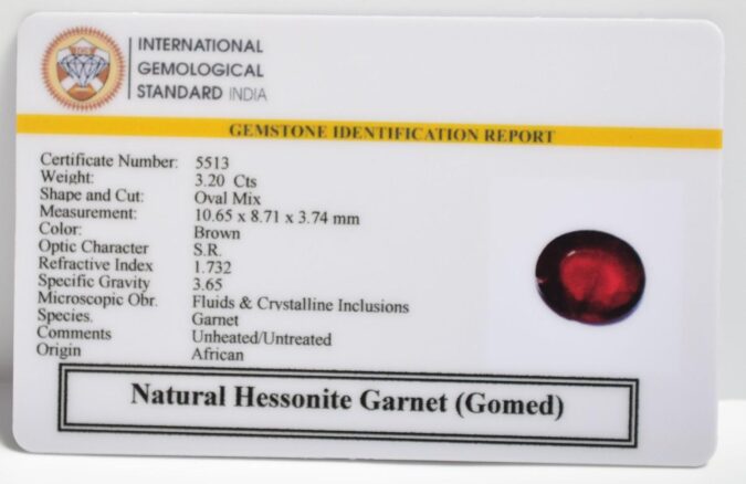 Beautiful 3.2 Cts Natural Hessonite Garnet (Gomed) (AAA-Mines) sva 3+ Ratti HESSONITE GOMED. Free Horoscope & Free Pundit Ji Astrological Advise / Consultation. Original Natural Lab certified gems by IGI GTL / Birth stones / Large Gem Selection of shree shubh Rashi Ratan Vedic dhan at Gem Mines. May Bhagwan Brahma, Vishnu, Shiv & Universe bless you.