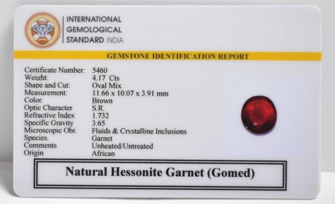 Beautiful 4.17 Cts Natural Hessonite Garnet (Gomed) (Very Good-Mines) sva 4+ Ratti HESSONITE GOMED. Free Horoscope & Free Pundit Ji Astrological Advise / Consultation. Original Natural Lab certified gems by IGI GTL / Birth stones / Large Gem Selection of shree shubh Rashi Ratan Vedic dhan at Gem Mines. May Bhagwan Brahma, Vishnu, Shiv & Universe bless you.