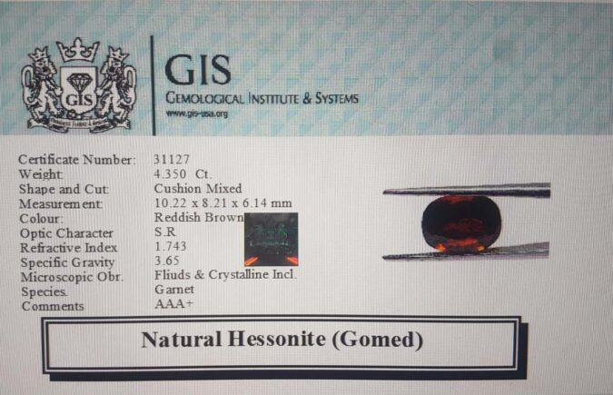 Beautiful 4.35 Ct. Hessonite (Gomed) (Ceylon Sri Lanka Mines) Sava 4 Ratti Gomed. Free Horoscope & Free Pundit Ji Advise / Consultation. Original Natural Lab certified gems by IGI GTL / Birth stones / Large Gem Selection of shree shubh Rashi Ratan Vedic dhan at Gem Mines. May Bhagwan Brahma, Vishnu, Shiv & Universe bless you.