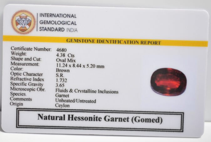 Beautiful 4.38 Cts Natural Hessonite Garnet (Gomed) (AAA-Mines) sva 4+ Ratti HESSONITE GOMED. Free Horoscope & Free Pundit Ji Astrological Advise / Consultation. Original Natural Lab certified gems by IGI GTL / Birth stones / Large Gem Selection of shree shubh Rashi Ratan Vedic dhan at Gem Mines. May Bhagwan Brahma, Vishnu, Shiv & Universe bless you.