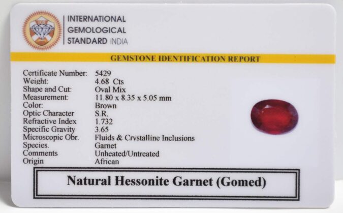 Beautiful 4.68 Cts Natural Hessonite Garnet (Gomed) (AAA+-Mines) sva 5+ Ratti HESSONITE GOMED. Free Horoscope & Free Pundit Ji Astrological Advise / Consultation. Original Natural Lab certified gems by IGI GTL / Birth stones / Large Gem Selection of shree shubh Rashi Ratan Vedic dhan at Gem Mines. May Bhagwan Brahma, Vishnu, Shiv & Universe bless you.