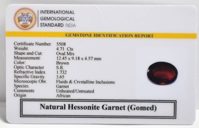 Beautiful 4.71 Cts Natural Hessonite Garnet (Gomed) (AAA-Mines) sva 5+ Ratti HESSONITE GOMED. Free Horoscope & Free Pundit Ji Astrological Advise / Consultation. Original Natural Lab certified gems by IGI GTL / Birth stones / Large Gem Selection of shree shubh Rashi Ratan Vedic dhan at Gem Mines. May Bhagwan Brahma, Vishnu, Shiv & Universe bless you.