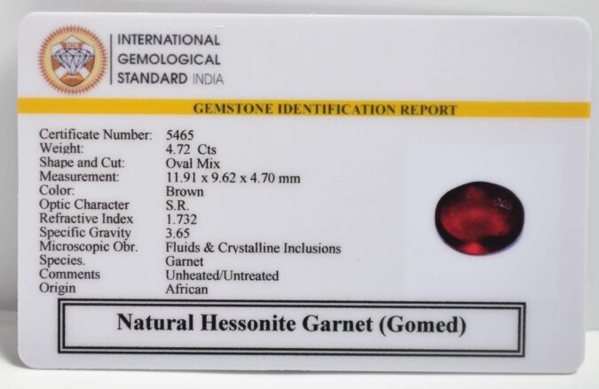 Beautiful 4.72 Cts Natural Hessonite Garnet (Gomed) (Very Good-Mines) sva 5+ Ratti HESSONITE GOMED. Free Horoscope & Free Pundit Ji Astrological Advise / Consultation. Original Natural Lab certified gems by IGI GTL / Birth stones / Large Gem Selection of shree shubh Rashi Ratan Vedic dhan at Gem Mines. May Bhagwan Brahma, Vishnu, Shiv & Universe bless you.