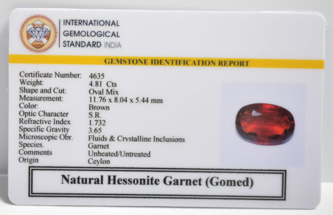 Beautiful 4.81 Cts Natural Hessonite Garnet (Gomed) (AAA+-Mines) sva 5+ Ratti HESSONITE GOMED. Free Horoscope & Free Pundit Ji Astrological Advise / Consultation. Original Natural Lab certified gems by IGI GTL / Birth stones / Large Gem Selection of shree shubh Rashi Ratan Vedic dhan at Gem Mines. May Bhagwan Brahma, Vishnu, Shiv & Universe bless you.