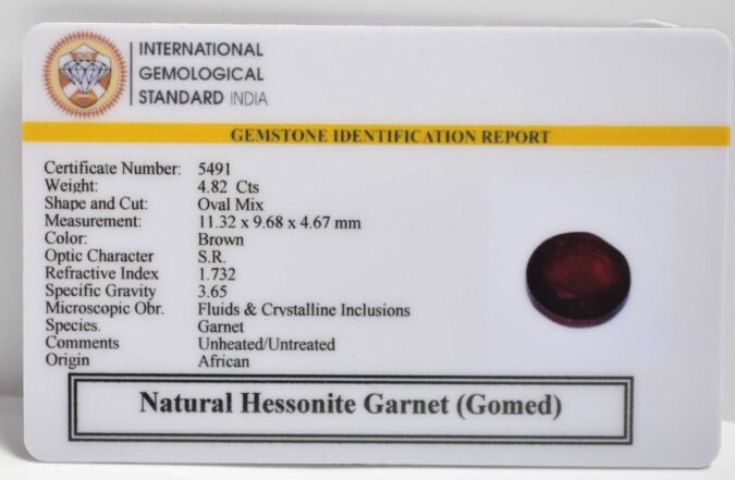 Beautiful 4.82 Cts Natural Hessonite Garnet (Gomed) (Very Good-Mines) sva 5+ Ratti HESSONITE GOMED. Free Horoscope & Free Pundit Ji Astrological Advise / Consultation. Original Natural Lab certified gems by IGI GTL / Birth stones / Large Gem Selection of shree shubh Rashi Ratan Vedic dhan at Gem Mines. May Bhagwan Brahma, Vishnu, Shiv & Universe bless you.