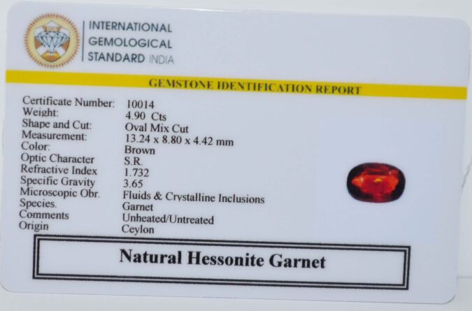 Beautiful 4.9 Cts Natural Hessonite Garnet (Top-Mines) sva 5+ Ratti HESSONITE GOMED. Free Horoscope & Free Pundit Ji Astrological Advise / Consultation. Original Natural Lab certified gems by IGI GTL / Birth stones / Large Gem Selection of shree shubh Rashi Ratan Vedic dhan at Gem Mines. May Bhagwan Brahma, Vishnu, Shiv & Universe bless you.