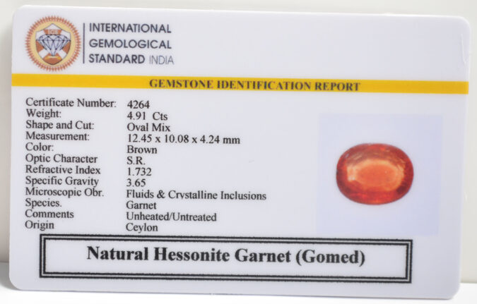 Beautiful 4.91 Cts Natural Hessonite Garnet (Gomed) (Top-Mines) sva 5+ Ratti HESSONITE GOMED. Free Horoscope & Free Pundit Ji Astrological Advise / Consultation. Original Natural Lab certified gems by IGI GTL / Birth stones / Large Gem Selection of shree shubh Rashi Ratan Vedic dhan at Gem Mines. May Bhagwan Brahma, Vishnu, Shiv & Universe bless you.