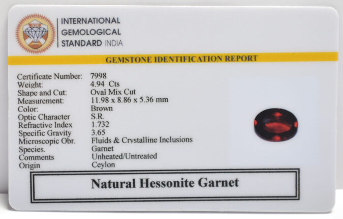 Beautiful 4.94 Cts Natural Hessonite Garnet (Top-Mines) sva 5+ Ratti HESSONITE GOMED. Free Horoscope & Free Pundit Ji Astrological Advise / Consultation. Original Natural Lab certified gems by IGI GTL / Birth stones / Large Gem Selection of shree shubh Rashi Ratan Vedic dhan at Gem Mines. May Bhagwan Brahma, Vishnu, Shiv & Universe bless you.