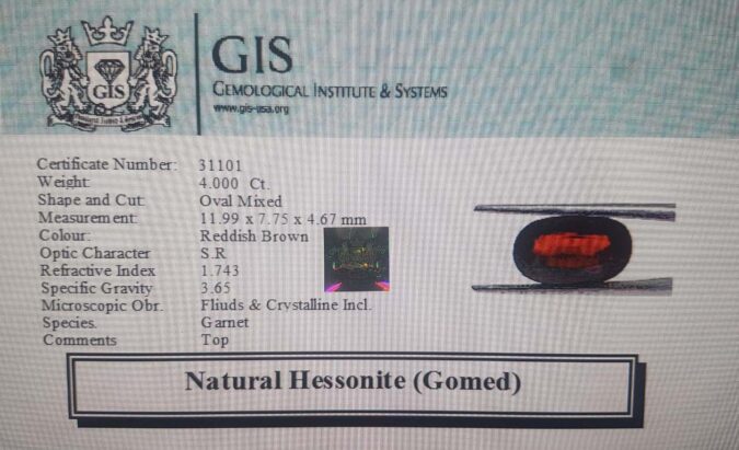 Beautiful 4 Ct. Hessonite (Gomed) (Ceylon Sri Lanka Mines) Sava 4 Ratti Gomed. Free Horoscope & Free Pundit Ji Advise / Consultation. Original Natural Lab certified gems by IGI GTL / Birth stones / Large Gem Selection of shree shubh Rashi Ratan Vedic dhan at Gem Mines. May Bhagwan Brahma, Vishnu, Shiv & Universe bless you.