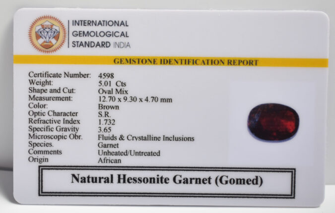 Beautiful 5.01 Cts Natural Hessonite Garnet (Gomed) (AAA-Mines) sva 5+ Ratti HESSONITE GOMED. Free Horoscope & Free Pundit Ji Astrological Advise / Consultation. Original Natural Lab certified gems by IGI GTL / Birth stones / Large Gem Selection of shree shubh Rashi Ratan Vedic dhan at Gem Mines. May Bhagwan Brahma, Vishnu, Shiv & Universe bless you.