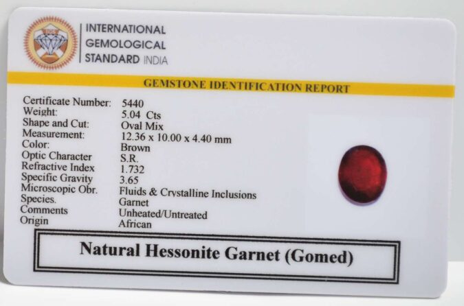 Beautiful 5.04 Cts Natural Hessonite Garnet (Gomed) (AAA+-Mines) sva 5+ Ratti HESSONITE GOMED. Free Horoscope & Free Pundit Ji Astrological Advise / Consultation. Original Natural Lab certified gems by IGI GTL / Birth stones / Large Gem Selection of shree shubh Rashi Ratan Vedic dhan at Gem Mines. May Bhagwan Brahma, Vishnu, Shiv & Universe bless you.