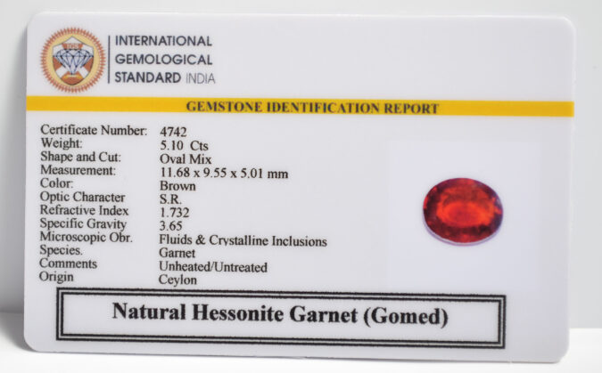 Beautiful 5.1 Cts Natural Hessonite Garnet (Gomed) (AAA-Mines) sva 5+ Ratti HESSONITE GOMED. Free Horoscope & Free Pundit Ji Astrological Advise / Consultation. Original Natural Lab certified gems by IGI GTL / Birth stones / Large Gem Selection of shree shubh Rashi Ratan Vedic dhan at Gem Mines. May Bhagwan Brahma, Vishnu, Shiv & Universe bless you.