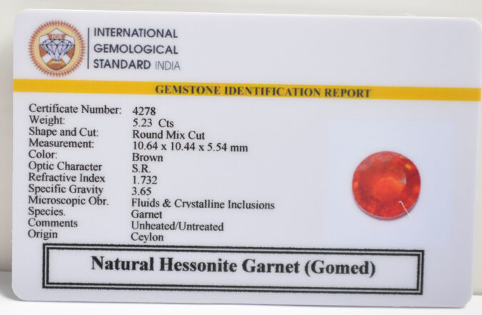 Beautiful 5.23 Cts Natural Hessonite Garnet (Gomed) (AAA+-Mines) sva 5+ Ratti HESSONITE GOMED. Free Horoscope & Free Pundit Ji Astrological Advise / Consultation. Original Natural Lab certified gems by IGI GTL / Birth stones / Large Gem Selection of shree shubh Rashi Ratan Vedic dhan at Gem Mines. May Bhagwan Brahma, Vishnu, Shiv & Universe bless you.