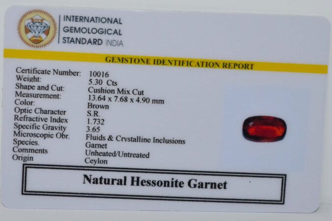 Beautiful 5.3 Cts Natural Hessonite Garnet (Top-Mines) sva 5+ Ratti HESSONITE GOMED. Free Horoscope & Free Pundit Ji Astrological Advise / Consultation. Original Natural Lab certified gems by IGI GTL / Birth stones / Large Gem Selection of shree shubh Rashi Ratan Vedic dhan at Gem Mines. May Bhagwan Brahma, Vishnu, Shiv & Universe bless you.