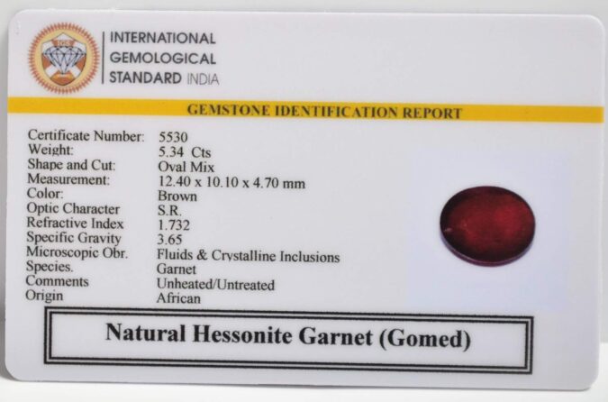 Beautiful 5.34 Cts Natural Hessonite Garnet (Gomed) (AAA-Mines) sva 5+ Ratti HESSONITE GOMED. Free Horoscope & Free Pundit Ji Astrological Advise / Consultation. Original Natural Lab certified gems by IGI GTL / Birth stones / Large Gem Selection of shree shubh Rashi Ratan Vedic dhan at Gem Mines. May Bhagwan Brahma, Vishnu, Shiv & Universe bless you.
