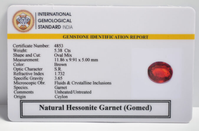 Beautiful 5.38 Cts Natural Hessonite Garnet (Gomed) (AAA+-Mines) sva 5+ Ratti HESSONITE GOMED. Free Horoscope & Free Pundit Ji Astrological Advise / Consultation. Original Natural Lab certified gems by IGI GTL / Birth stones / Large Gem Selection of shree shubh Rashi Ratan Vedic dhan at Gem Mines. May Bhagwan Brahma, Vishnu, Shiv & Universe bless you.