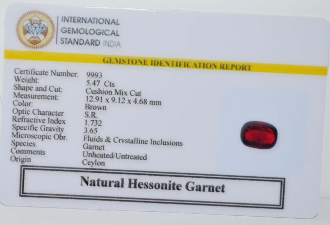Beautiful 5.47 Cts Natural Hessonite Garnet (AAA+-Mines) sva 6+ Ratti HESSONITE GOMED. Free Horoscope & Free Pundit Ji Astrological Advise / Consultation. Original Natural Lab certified gems by IGI GTL / Birth stones / Large Gem Selection of shree shubh Rashi Ratan Vedic dhan at Gem Mines. May Bhagwan Brahma, Vishnu, Shiv & Universe bless you.