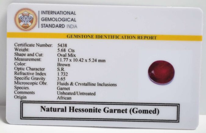 Beautiful 5.68 Cts Natural Hessonite Garnet (Gomed) (AAA+-Mines) sva 6+ Ratti HESSONITE GOMED. Free Horoscope & Free Pundit Ji Astrological Advise / Consultation. Original Natural Lab certified gems by IGI GTL / Birth stones / Large Gem Selection of shree shubh Rashi Ratan Vedic dhan at Gem Mines. May Bhagwan Brahma, Vishnu, Shiv & Universe bless you.