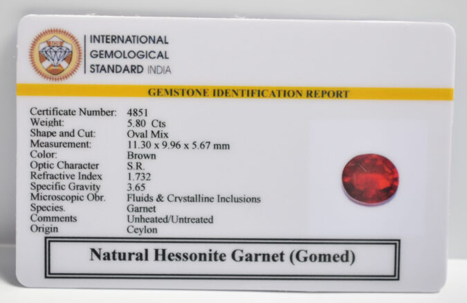 Beautiful 5.8 Cts Natural Hessonite Garnet (Gomed) (AAA+-Mines) sva 6+ Ratti HESSONITE GOMED. Free Horoscope & Free Pundit Ji Astrological Advise / Consultation. Original Natural Lab certified gems by IGI GTL / Birth stones / Large Gem Selection of shree shubh Rashi Ratan Vedic dhan at Gem Mines. May Bhagwan Brahma, Vishnu, Shiv & Universe bless you.